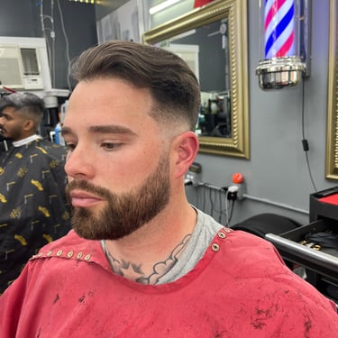 Detailed trims, line-ups, conditioning, and beard dye for a sharp finish.