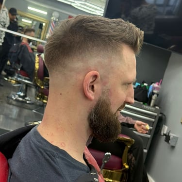 Detailed trims, line-ups, conditioning, and beard dye for a sharp finish.